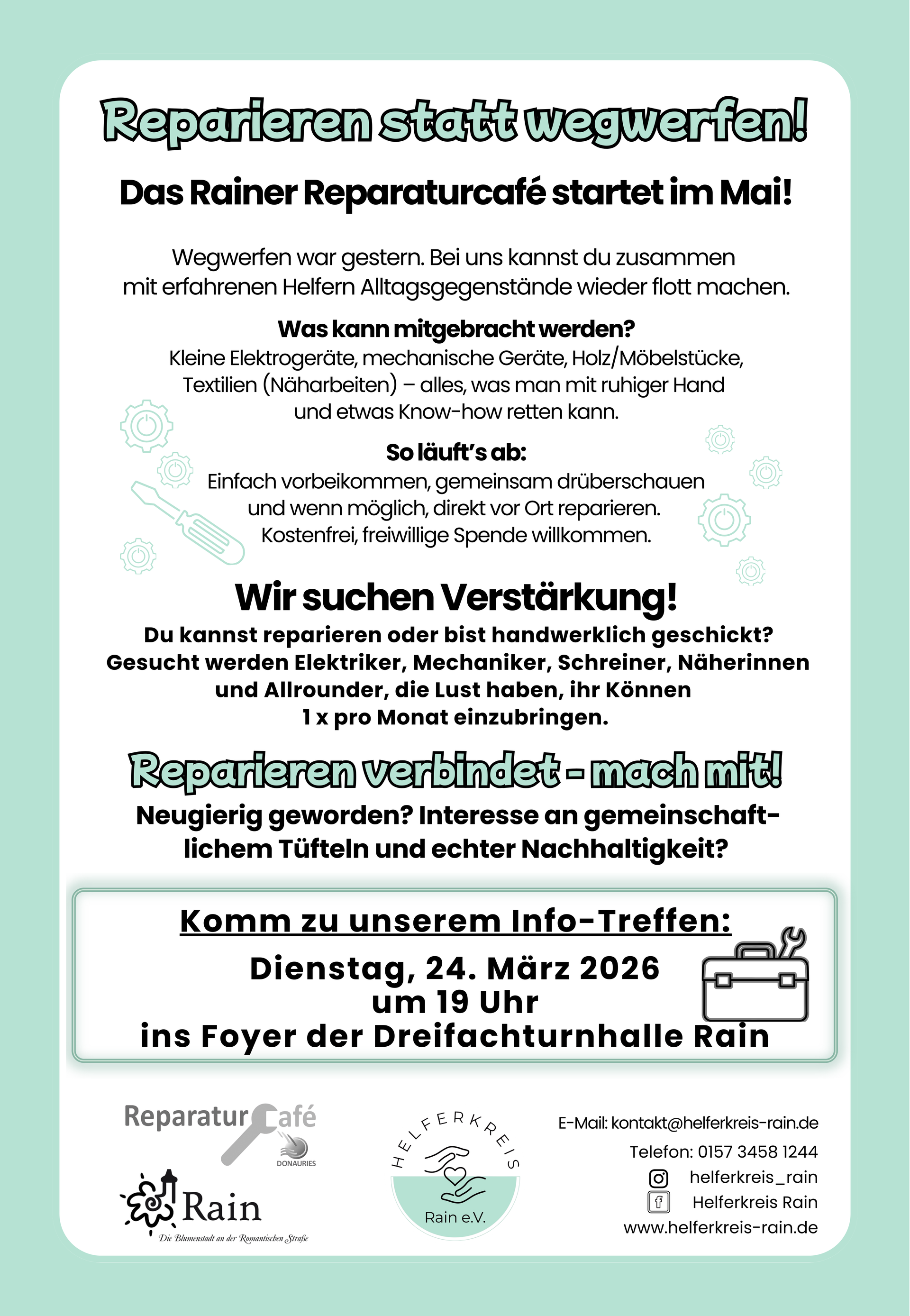 Reparieren statt wegwerfen. WIR SUCHEN VERSTÄRKUNG für das Reparaturcafe in Rain (Eröffnung im Mai). Du kannst reparieren oder bist handwerklich geschickt? Dann komm zu unserer Informationsveranstaltung im Foyer der Dreifachturnalle Rain am Dienstag, 24. März um 19 Uhr.